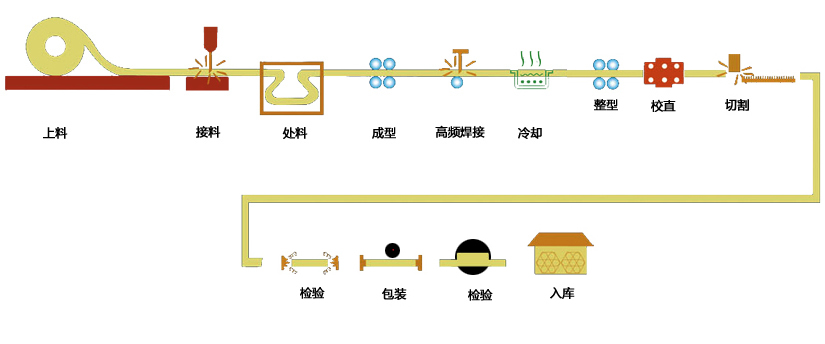 公司拥有高精度去内毛刺的Ф25、Ф28、Ф32、Ф50、Ф60等高频直缝焊管生产线,可生产外径Ф8~Ф70mm,壁厚0.4~3.0mm的圆管及各种规格的方矩管、异形管,也可根据客户需要定制各种要求的钢管。